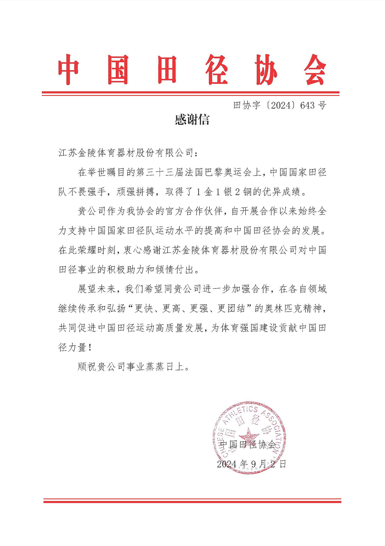 信中說:在舉世矚目的第三十三屆法國巴黎奧運會上,中國國家田徑隊不畏強手,頑強拼搏,取得了1金1銀2銅的優異成績。